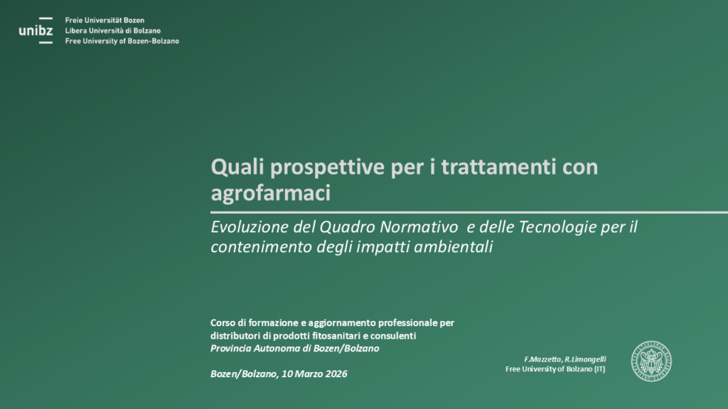 On 10 March 2026, Fabrizio Mazzetto and Roberto Limongelli spoke in the training and professional development course for distributors of plant protection products and consultants organised by the Autonomous Province of Bolzano held at Südtiroler Bauernbund in Bolzano, about ‘What are the prospects for treatments with agrochemicals / Evolution of the regulatory framework and technologies for limiting environmental impact’. The meeting was attended by about 40 operators in the sector, including farmers, consultants and technical assistance experts.