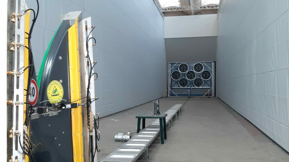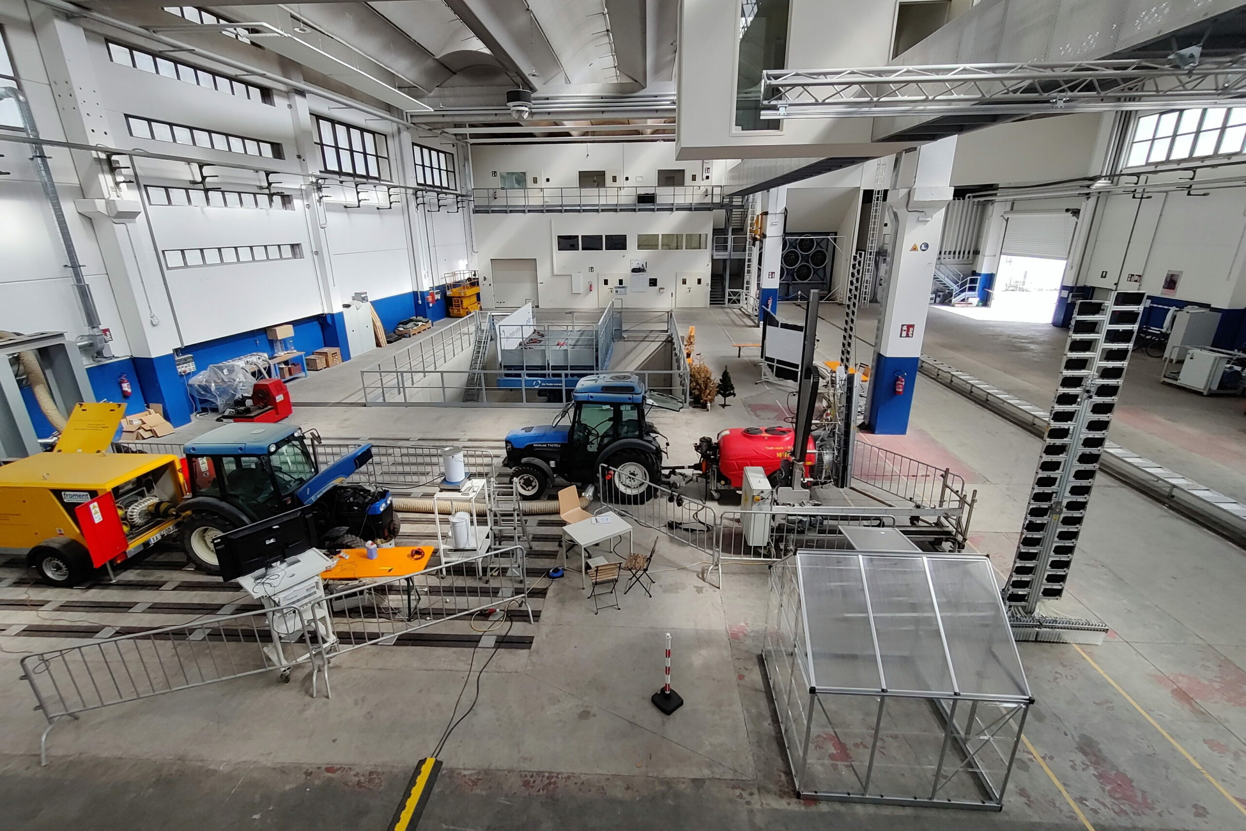 Space enclosed by movable walls (width 6 m, length 30 m, height 10 m) for analysing drift phenomena associated with the use of full-scale sprayers. Semi-field test environment with the possibility of controlling the air flow speed (in laminar motion up to 5 m/s) thanks to 7 extractor fans with a total electrical power of up to 170 kW.